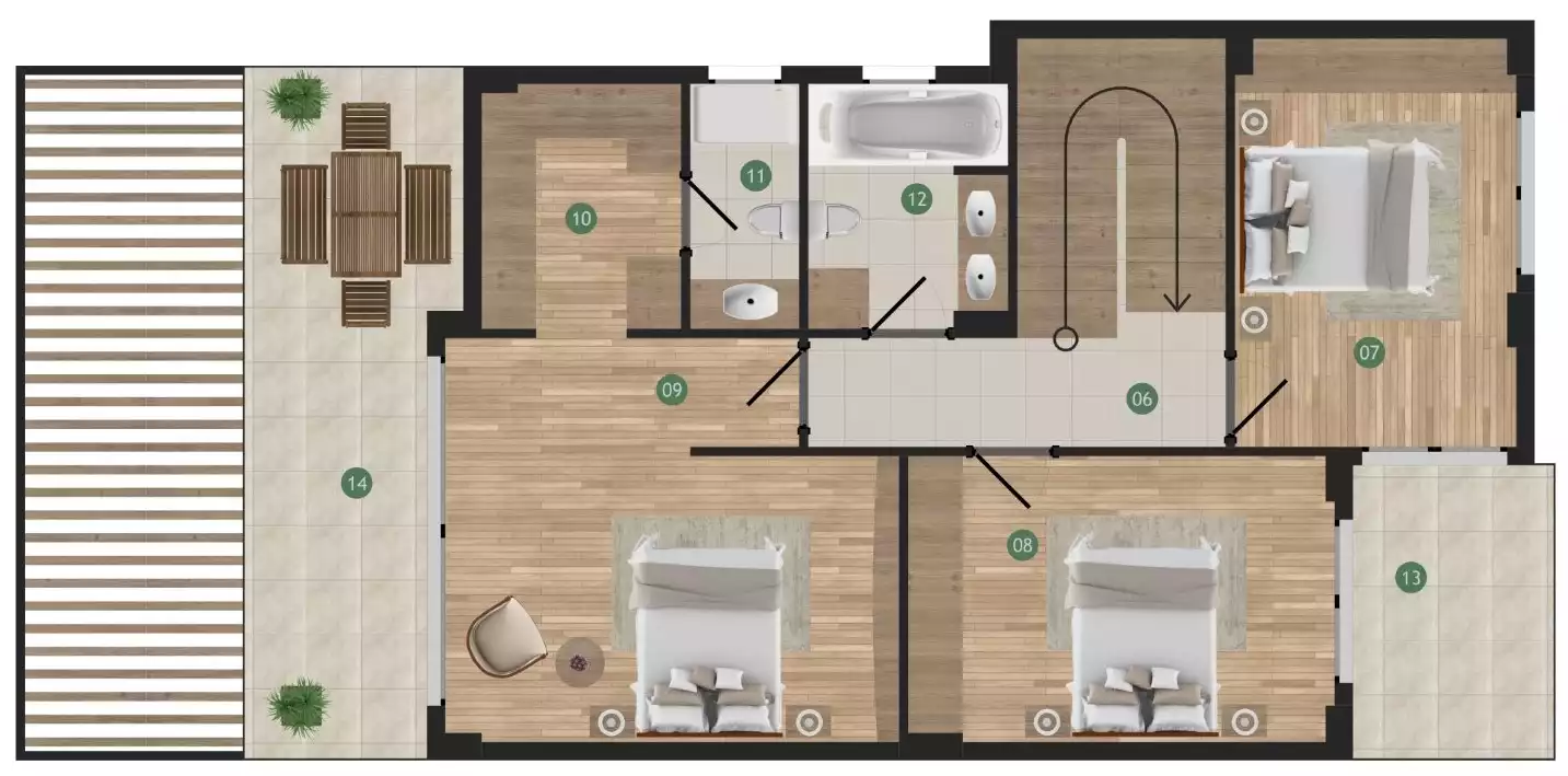 Yeşilkent Mansions is a new project, it's located just at the entrance to Yeşilkent and only 600 meters away from the Aegean Sea. Yeşilkent is only 5 minutes drive away from Altinkum's front and is located in the next bay. It has its promenade, bars and restaurants. The gated complex has a communal pool and a beautiful garden. The complex has two types of villas: 4 bedrooms with a separate kitchen and 5 bedrooms with an open kitchen. Each villa has underfloor heating, making living all year round comfortable. There are dressing rooms in each bedroom. Kitchen and bathroom furniture is installed as well. The living space excluding balconies and terraces is very large with a net usage of 166 m² and totalling 231 m² including the balconies. Every villa has private car parking, a veranda and a garden. The Project is still under construction but is about 95% complete.